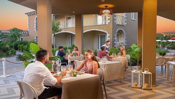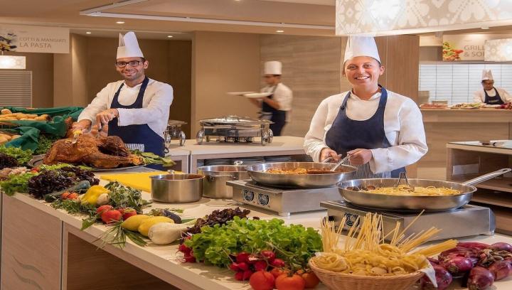 Usluga u hotelu je all inclusive gosti mogu da uživaju u raznovrsnoj hrani i pićima tokom celog dana. U centralnom restoranu se služe bufet doručak, ručak i večera uz show-cooking stanice sa italijanskim i međunarodnim jelima, a za ljubitelje lokalnih ukusa tu je i tradicionalni restoran La Gaddura sa sardinijskim specijalitetima i Le Onde restoran na plaži za ručkove i večere uz more (obično u sezoni). Tokom dana u nekoliko barova širom resorta (lobby bar, bar na plaži, bar pored bazena i bar za Prestige sobe) gostima su dostupni alkoholna i bezalkoholna pića, kokteli, sladoledi, užine, sendviči, tapas i slatke poslastice, u razčličito doba dana. Za porodice sa malom decom postoji Baby Kitchen prostor gde roditelji mogu pripremiti hranu za najmlađe.
