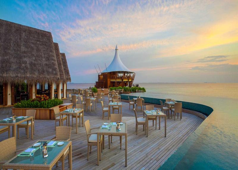 Poseduje 3 restorana: Lime Restaurant – indijska i međunarodna kuhinja, Cayenne Grill – indijska, japanska, singapurska, azijska, loklana, pica, morski plodovi, suši, roštilj, stejkhaus i The Lighthouse Restaurant – mediteranska, međunardona, evropska. Može se organizovati i privatna večera u vili, na izolovanom peščanom sprudu ili terasi iznad lagune. Bar Sailors nudi pića pod palmama tokom celog dana, a tu je i salon za večernje koktele i cigare, iz kojeg se pruža pogled na more.